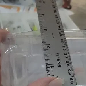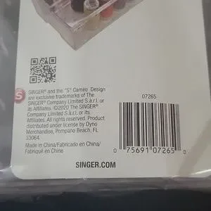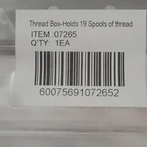 New in package, Singer brand holds 19 spools of thread, clear plastic. measures 8" long x 4.5" wide x 2.5" deep, with a lid.