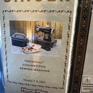 Mint In Box Unused Home Play by Nkok Singer "Original" Chain Stitch Toy Sewing Machine. Model Number A 2401. Battery Operated Sewing Machine For Children-Produces a Neat Chainstitch-Working Light-Tension Dial-Foot Pedal Control Storage Department-Requires Two "C" or LR14 Batteries (not included). Box measures about 16" long-use that for a reference on the size of the sewing machine