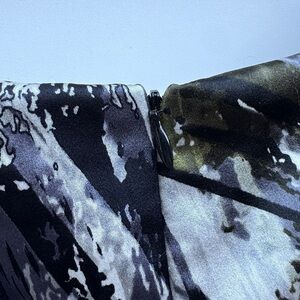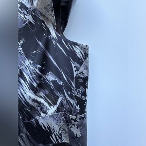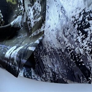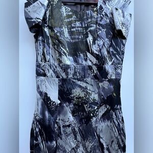Cap sleeve with cold shoulder detail, lined, zippered back, 100% silk, shift dress, splatter abstract palm print in grey, white, and black
