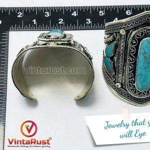 The design of the vintage bracelet is inspired by the Kuchi tribal jewelry ornaments. It features stonework and intricately carved motifs, faulting all the traditional vibes. The classy pair has silver rusty hues complementing the cool shade of turquoise and lapis.