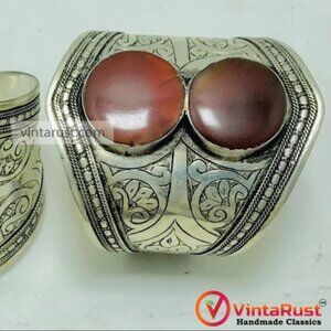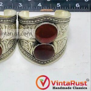 • Experience the timeless beauty and craftsmanship of Afghan tribal jewelry with these mesmerizing cuffs. Each cuff features enamelled brown stones, showcasing one oval-shaped semiprecious stone at the center with hammered design.