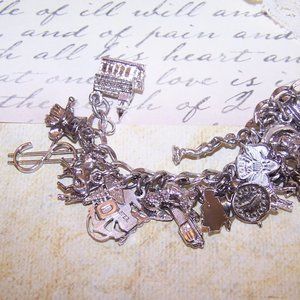 Dating to the 1960s or so, may I offer this Sterling Silver (hallmarked as pictured) single link charm bracelet (spring catch closure) that I am selling just as I found - complete with 42 charms. Everything, including the bracelet and charms, are covered in a heavy later of rhodium making all the pieces VERY shiny. Length of the bracelet is 7" and the charms are in the 1/2" and up range. Weight of the piece with all the charms is 62.1 grams. On the bracelet you get.....