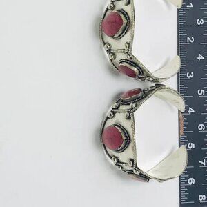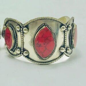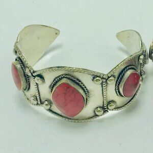 This amazing seilver toned vintage bracelet is made of semi-precious red coral stone and metal alloy combination. The one-of-a-kind handcrafted bracelet is an antique kuchi ornament, adorned with intricately carved designs and a large coral stone in the center.