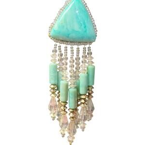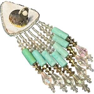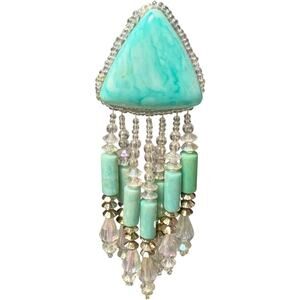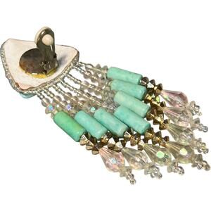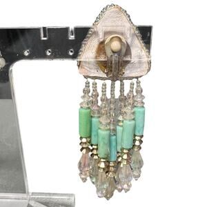 Girl, sometimes the most amazing pieces come solo and this vintage beauty is PROOF! This single statement earring is actually a blessing in disguise - you get all the drama and glamour without the commitment of matching pairs. That gorgeous turquoise triangle stone catches light like ocean waves, while the cascading crystal fringe creates this mesmerizing chandelier effect that moves with you. Mixed with mint green cylindrical beads and champagne crystal drops, it's giving major asymmetrical chic vibes that are so on-trend right now! The clip-on design means comfort without pierced ears. This single stunner pairs killer with your hair swept to one side, letting it be the star of the show. Perfect for that editorial asymmetric look, or mix and match with different studs on the other ear. Whether brunch, date night, or events where you want that perfect conversation starter, this solo act delivers serious vintage glamour with modern edge.