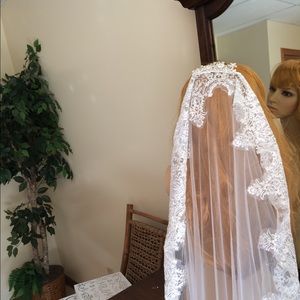 Single layer ivory wedding veil. Pins in with decorative hair pins and has a detachable comb. Silver thread thru veil. Sparkles beautifully under lights.measures 112 inches long!