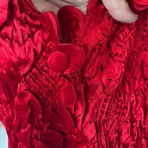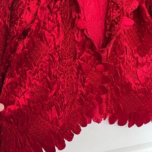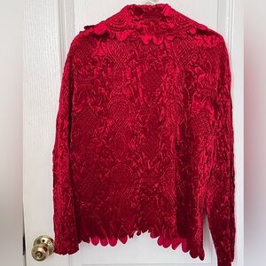 Size - Large. Beautiful textured velvety type blazer. Perfect for the holidays. Scalloped opening and around the bottom with a single button.