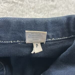 Dark wash denim with fade panels in front and back. Features fringed cuffs, hem, pocket edges, and collar. Silver buttons, and not much for stretch. Light stain on one of pockets, see last pic. Size just says P, but would best fit medium from measurements. Please compare to your own to ensure a good fit!