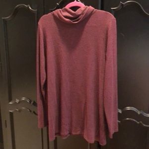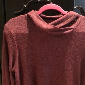 Soft and comfy. Heathered wine color. Front neck crossover. And the best part - POCKETS. Measures 19” pit to pit without stretching. Rayon spandex material. Measures 30” from shoulder to hem.