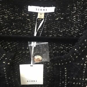 Chic black knit blazer with gold accents. Features elegant button details. Perfect for sophisticated style.it does not button, buttons are for style only.