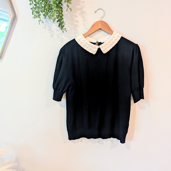 beautiful Sioni Milano black knit top with pearl embellished peter pan color.