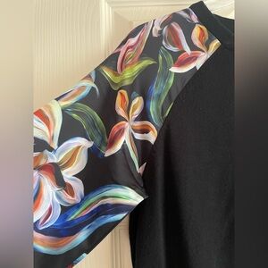 This Sioni sweater features a classic crew neck design with a striking contrast of a solid black body and vibrant pink floral sleeves. The intricate floral pattern on the sleeves adds a touch of artistic flair, making it a standout piece in any wardrobe. Smoke free environment.