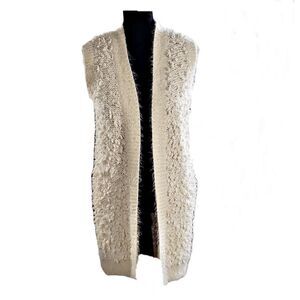 Trendy & chic cream knotted super soft angora-feel fabric features cable knit trim around the collarless neckline down the front, and hem. This warm, full-length waistcoat is perfect for layering on any occasion including office, casual meetings, and going out. Excellent LN (pre-loved) condition. No signs of garment distress. The cover photo is not a true representation of the actual item for sale.