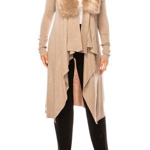 Dress up or down this lovely long, open-front, ribbed cuff sleeve sweater that features a fluffy removable faux-fur collar, along with a front-ribbed, sharkbite hem.