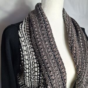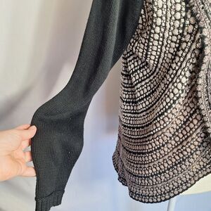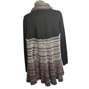 Stylish black cardigan featuring a patterned shawl collar in brown and cream. Chunky, Cozy ready for the cooler months. Office, Business Casual, Outings, Events, Outdoors. Hippie Lagenlook