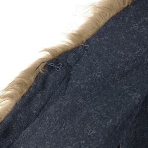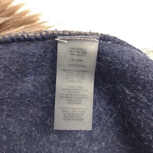This beautiful long faux fur trimmed sweater vest from Sioni Studio features 100% acrylic body, open style with a single clasp near the top, two lower front pockets and 8" side slits. It has a brown exterior, brown with black tips faux fur, and a marled navy blue interior. Hand washing is recommended.