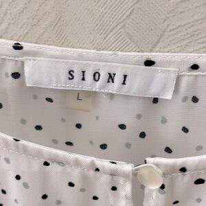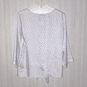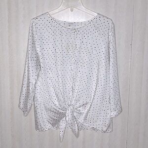 Elegant white blouse with black dot pattern. Features a stylish front tie. Perfect for casual or formal wear.
