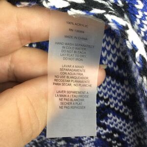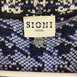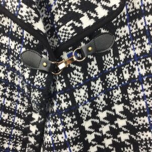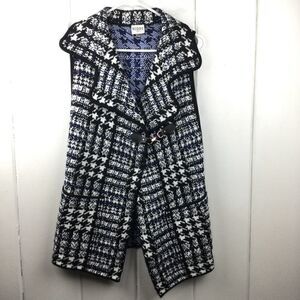 Sioni knit white, blue & black houndstooth / checked vest. Size - Small/Medium Petite. 100% acrylic. This vest has 2 front pockets and a metal/leather clasp closure in the front. It is in excellent shape with no holes or stains. Perfect for those chilly winter or spring days! Can also be used as a business casual or career piece to warm up in the office!