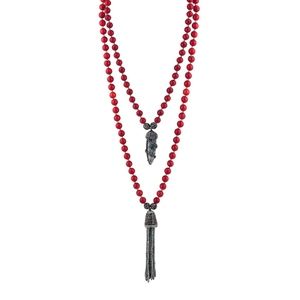 This Sioro statement necklace has double strands of red beads interspersed with Swarovski encrusted round rondelles.