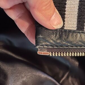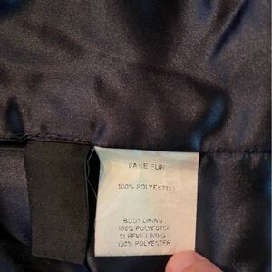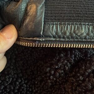 Faux Shearling. Minor scuffing to the leather near base of zipper- not noticeable. See last two pictures. Snap closures on 2 front pockets.