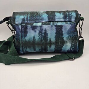 Used like new condition. Beautiful blue and green colors. It has a snap closure pocket on the back, a zipper closure on the front and a flap that covers a zipper closure on the top of the purse. Inside there is one zipper pocket and two slot pockets. The adjustable strap is green to match the edging and can be unhooked. The hardware is a gun metal color.