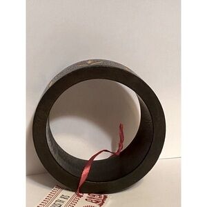 New with tags, this dark brown wooden bangle measures approximately 2.5 inches in diameter and 1 inch in width. It features a repeating carved leaf pattern in a lighter wood tone. The bangle is made of smooth wood and is handmade. Small imperfections may be present.