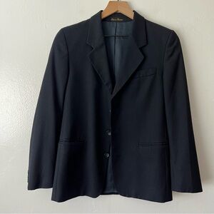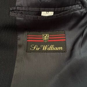 Crafted with care in Romania, this high-quality suit jacket from Sir William offers a timeless, polished look. Made from 100% pure wool. It features a button front closure, buttons on the sleeve ends, pointed collar, chest pocket, inside pocket, slight shoulder padding, and two front pockets with the option to hide the pocket flaps. It is fully lined. The navy color is classic, subtly enhanced by barely noticeable light stripes for an understated elegance. Can work as unisex. In excellent condition. *Tagged COS for exposure