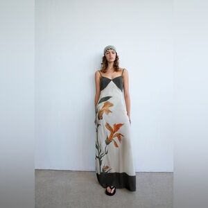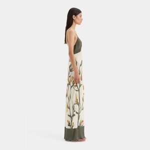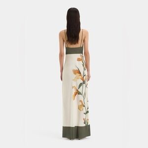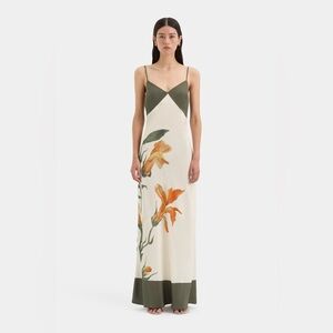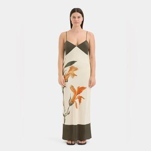 The Constance Slip Dress is a bias cut silhouette, defined with slender straps, a v-neckline and a contrast green detail through the bust and hem. Patterned with hand-painted florals and crafted from lightweight silk crepe de chine for a soft drape. Elegant maxi dress featuring a beautiful floral design with orange and green accents. Perfect for any occasion.