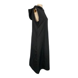 features: Polyester/nylon high quality made fabric in black. Lined. Hooded. Sleeveless. Midi/maxi length (depending on height). 1/2 zip front detail. Pockets. Pull over.