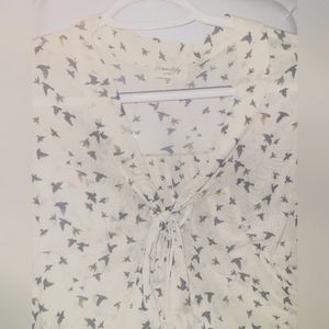 White colored blouse with bird print. Cap sleeves, fringe tassels ties