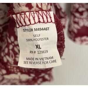 This is a Burgundy Red Floral Tunic Top in size XL from Siren Lily Maternity. It features a V-Neck with 3/4 Roll Tab Sleeves, made of breathable mesh polyester fabric. The tunic has a semi-sheer quality with button accents, offering stretch for comfort. Perfect for expecting mothers, this blouse has a stylish and flowy design.