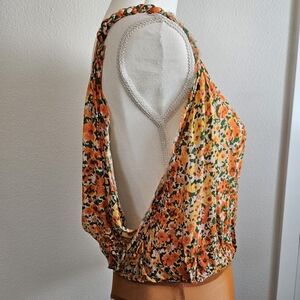 Embrace vibrant style with this floral orange wrap top. Perfect for adding a pop of color to your wardrobe.