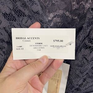 Charcoal gray coloring. Tags still attached. Excellent condition. Style 5548. Devonshire aria lace gown. Lined. Zips in back. Sleeved. Great mother of the bride dress.