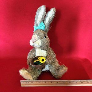 Sisal Bunny Rabbit Holding a Basket of Sunflowers Green Ribbon Decor Figure Easter Spring 12" Tall