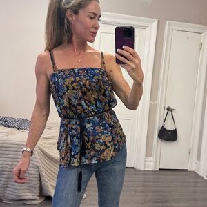 Elevate your wardrobe with this chic Sisley silk top in a multicolor floral print. Designed with slim adjustable straps and a relaxed fit, it comes with a matching braided tassel belt to cinch the waist for a flattering silhouette. The luxurious silk fabric drapes beautifully, making it perfect for pairing with jeans, skirts, or layering under a blazer.