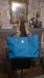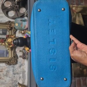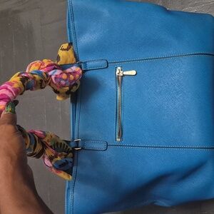 Elegant blue tote with colorful scarf handles. Adds flair to any look.