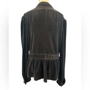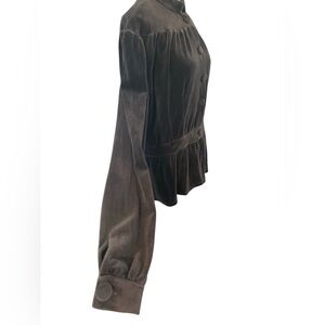 This top is stunning!! Chic charcoal velvet top by Sisley. Soft texture with a classic design. It has matching velvet buttons. Spare button is attached. It’s a peplum design adding elegant sophistication.