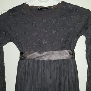 Ribbon tie can be worn in front or back. Cotton under skirt with sheer overlay. Shoulder to bottom of dress 26".  sleeve length 15" from the armpit to wrist,  11" armpit to armpit