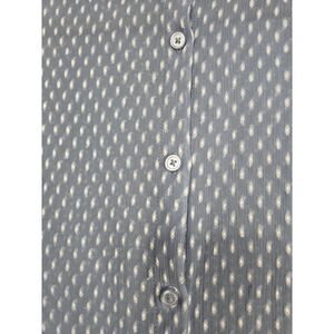 Style: Sheer textured buttondown blouse with fringe accents. Unique short-fringe mock neckline. Full buttons down the front. Long, mini-balloon sleeves with button closure at wrists and more fringe accent. Material is sheer chiffon with textured diamond-dots throughout. No material tag. Slightly crinkled texture. Some stretch. Made in Italy. Can fit as a Medium with relaxed silhouette, or slightly more fitted Large.