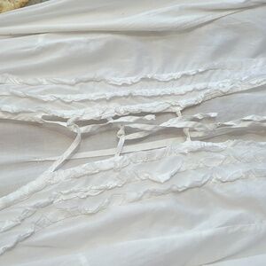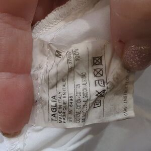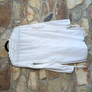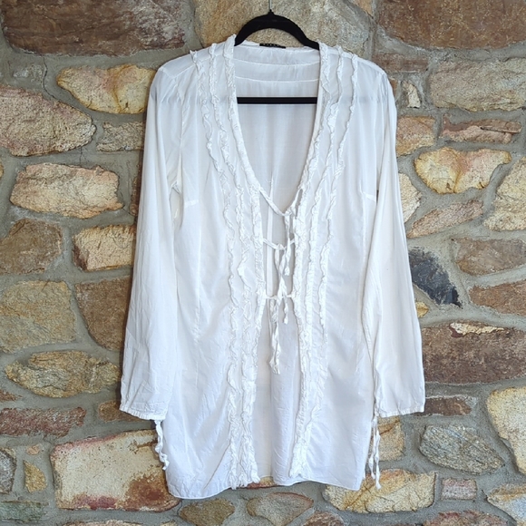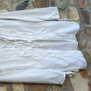 Sisley branded white tunic top. Simple, clean design. Lightweight fabric. Classic neckline and long sleeves. Easy to style for many looks. this would make a perfect Beach cover-up. lightweight breathable cotton with ruffle details. excellent pre-owned condition. size medium from sisley. made in Italy.