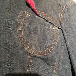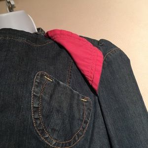 Sisley - unique denim jacket. Unique collar, stitching, pockets. Hot pink details underneath. Made in Italy. Size 44 Europe, fits like a medium