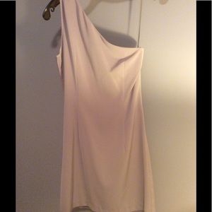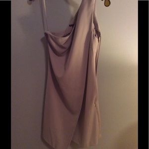 No iron one shoulder dress. Mini length. Fitted on back and faux wrap front. Nude color. Machine washable cold.