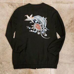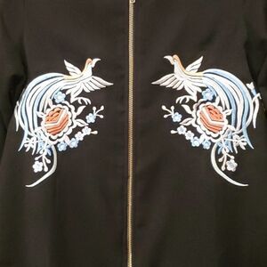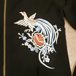 In like new condition. Absolutely gorgeous black with gold metal zipper. Floral bird embroidery in front and back. Has elastic at the end of the sleeves and bottom. Measures 17 inches armpit to armpit and 26 inches long. Sleeves measures 17.5 inches from armpit to bottom. Size xs no material tags. Fully lined lightweight jacket or could be worn as a top. Beautiful unique piece. Feel free to ask questions and make offers