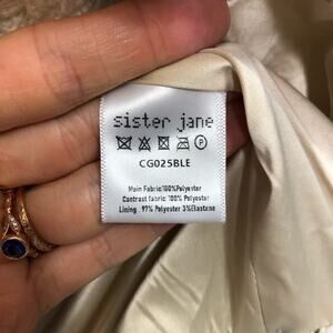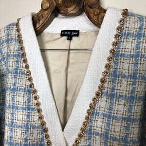 Sister Jane Blazer Cardigan Metallic Blue Tweed Plaid Long Bejeweled V Neck S