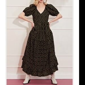 The ruffly hem, puff sleeves, and tiny orange flowers make this a chic and breezy pick for late-summer days. A shirred waistline, puff-sleeves, and ruffled hem add femininity to the piece. Fabric: Mid-weight, non-stretch seersucker Floral pattern V neck and puff sleeves with elastic cuffs Maxi length with tiered skirt and ruffle hem Hidden zip at side 100% cotton Lining: 65% viscose/35%