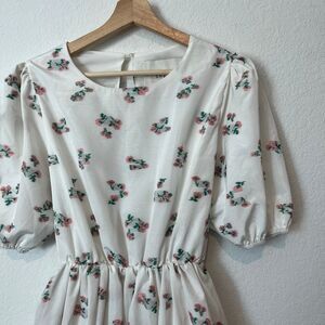 White & Pink Floral Embroidered Taffeta Puff Sleeve Tie Back Poofy Mini Dress