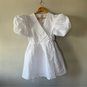 Acres of bliss surround you in this sweet wrap dress. In a white floral jacquard, your smile is set as you stroll through summer rays. You adore the statement puff sleeves and delicate waist ties. Summer has never tasted sweeter.