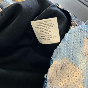 These are fully sequined with a cloud pattern of sequins. Multicolor blue with gray clouds. Drawstring closure, lined. Note that occasional threads from the sequin material may be seen. SOme areas have shifted sequins to reveal the white base.