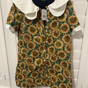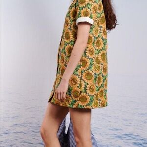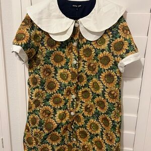 Charming mini dress with sunflower print. Features a large white collar. Perfect for a sunny day.