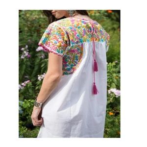 Sister Mary by Cousin Earl has made a great embroidered mexican style dress. The white cotton background is the perfect base for the colorful embroidery to pop. The back of the dress has a tie closure with a tassel. Great for any occasion.
