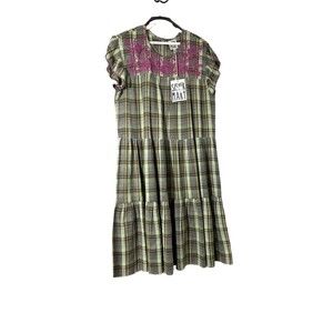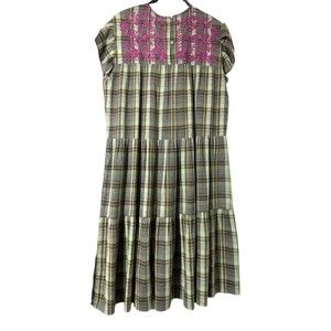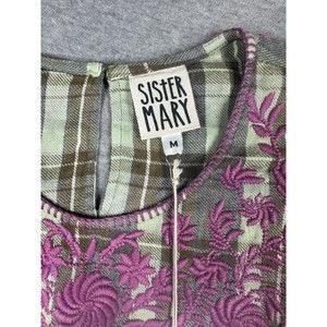 Sister Mary Embroidered Paloma Shift Dress Cotton Plaid Floral Flutter Sleeve M